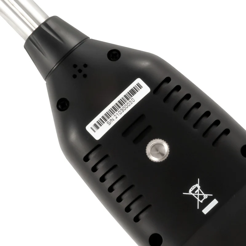El acumulador interno con una capacidad de 1000 mAh del anemómetro de hilo térmico permite usar este dispositivo de forma móvil. El acumulador del anemometro de hilo termico se carga a través de la interfaz micro USB. Esto significa que puede cargar el anemómetro de hilo térmico en cualquier interfaz USB de 5 V. Por otro lado, el anemómetro de hilo térmico integra una rosca de 3/8″ en la parte posterior que permite posicionarlo de forma óptima sobre un trípode.