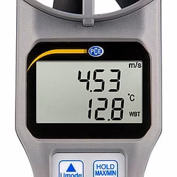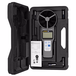 El anemómetro de rueda alada es un instrumento versátil para medir la velocidad del aire, el caudal del aire, la temperatura, la humedad relativa, el punto de rocío y la temperatura de bulbo húmedo. Con las cubiertas opcionales del anemometro puede medir el flujo volumétrico. Para medir la velocidad del viento y el flujo volumétrico, el anemómetro tiene una rueda con un diámetro de 10 cm. El anemometro también ofrece diferentes funciones, como la medición de valores extremos, la función HOLD, una iluminación de fondo, la desconexión automática y el aviso cuando la batería esté baja de carga. Todo ello facilita al usuario su uso, haciéndolo muy confortable. Debido a sus pequeñas dimensiones y bajo peso, es ideal para uso móvil.