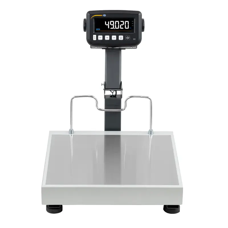 La superficie útil de la plataforma de la balanza digital es de 45 x 42 cm. En el lateral donde está el soporte con la pantalla hay una varilla de apoyo que facilita la correcta colocación de la carga a pesar. La balanza digital tiene un recubrimiento de pintura en polvo. Adicionalmente, la superficie de la plataforma dispone de una capa fina en acero inoxidable.