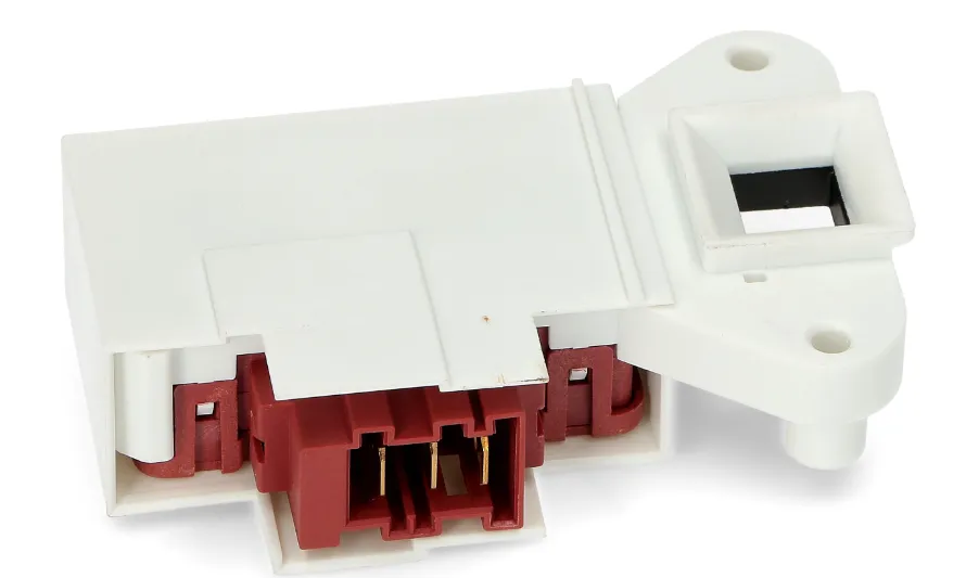 Retardador o blocapuerta para cierre de electrodoméstico de lavado. Esta pieza también hace de interruptor, evitando que el aparato se ponga en marcha cuando la puerta está abierta. En ocasiones, cuando la lavadora no funciona, es porque este recambio está mandando una señal equivocada al módulo del aparato.