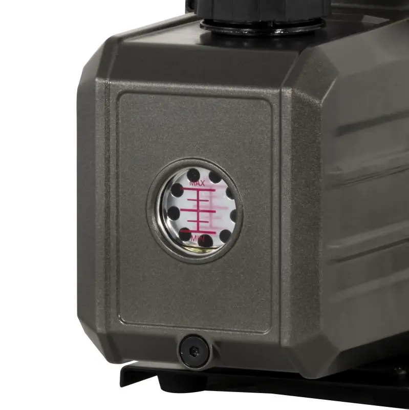 Nuestra bomba de vacío está equipada con un elemento filtrante de última generación que ayuda eficazmente a reducir la neblina de aceite. Este elemento filtrante no sólo mejora la vida útil de la bomba, sino que también proporciona un entorno de trabajo más limpio y ayuda a preservar el medio ambiente. El asa de goma de diseño ergonómico permite un transporte seguro y un buen manejo. Una bomba de vacío como esta se utiliza para vaciar los circuitos de aires acondicionados, sistemas de refrigeración o bombas de calor antes de llenarlos con refrigerante. Esto es importante para eliminar la humedad y el aire del sistema, lo que mejora la eficiencia del aire acondicionado o la bomba de calor.