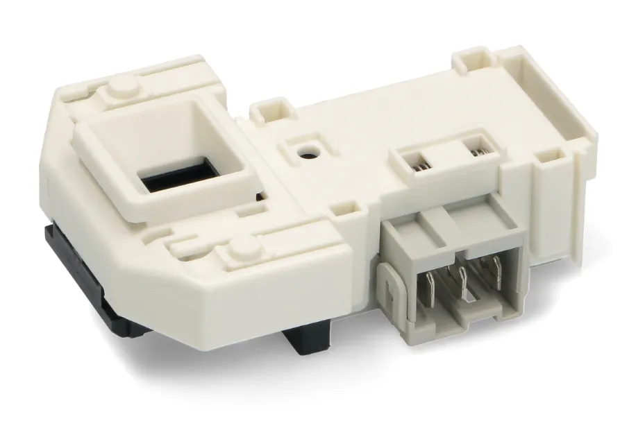 Cierre electrico puerta de lavadora Bosch, Siemens. Blocapuerta de recambio original. Esta pieza de reparación de lavadora evita la apertura de la lavadora mientras está funcionando y tiene un sistema retardador de unos minutos para bloqueo de puerta una vez el lavado haya acabado.