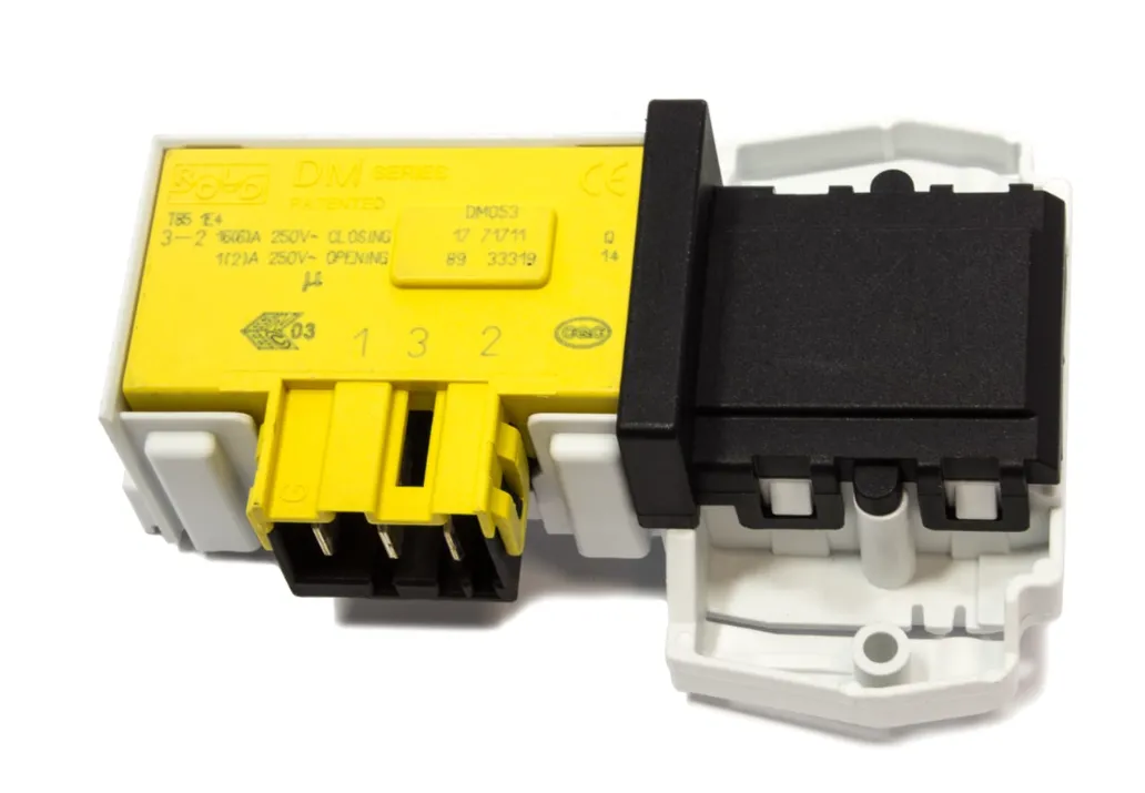 Cerradura eléctrica puerta lavadora Candy, Hoover. La cerradura hace de seguro de puerta para evitar la apertura durante el lavado y, además hace de interruptor del aparato.