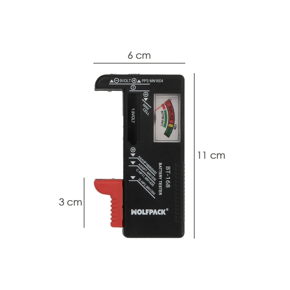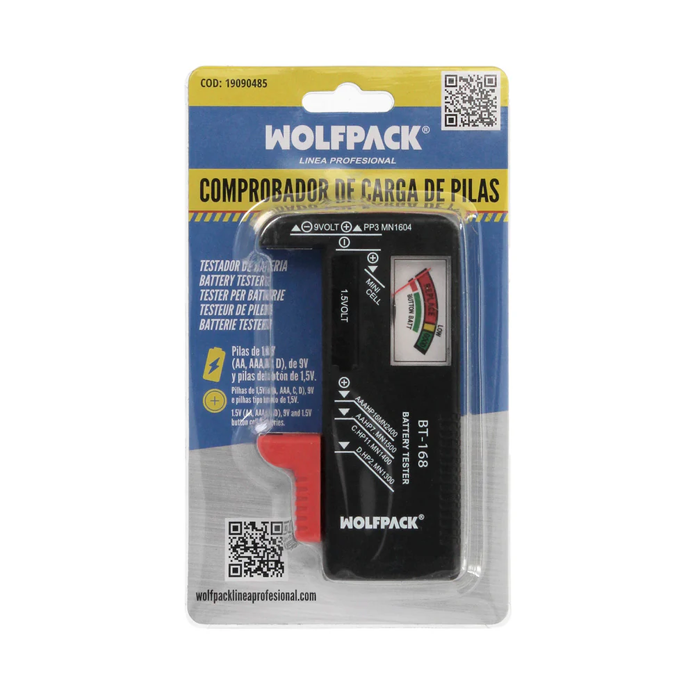 Comprobador de carga de pilas de la marca WOLFPACK LINEA PROFESIONAL.