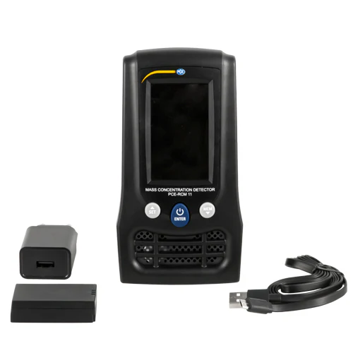 El contador de partículas PCE-RCM 11 sirven para la medición orientativa de parámetros medioambientales. El contador de particulas mide las partículas, la temperatura y la humedad relativa. La pantalla del contador de partículas muestra todos estos parámetros de forma alterna. Con el contador de partículas puede controlar el medioambiente durante un espacio de hasta 5 horas sin la necesidad de conectar el dispositivo a la red eléctrica.