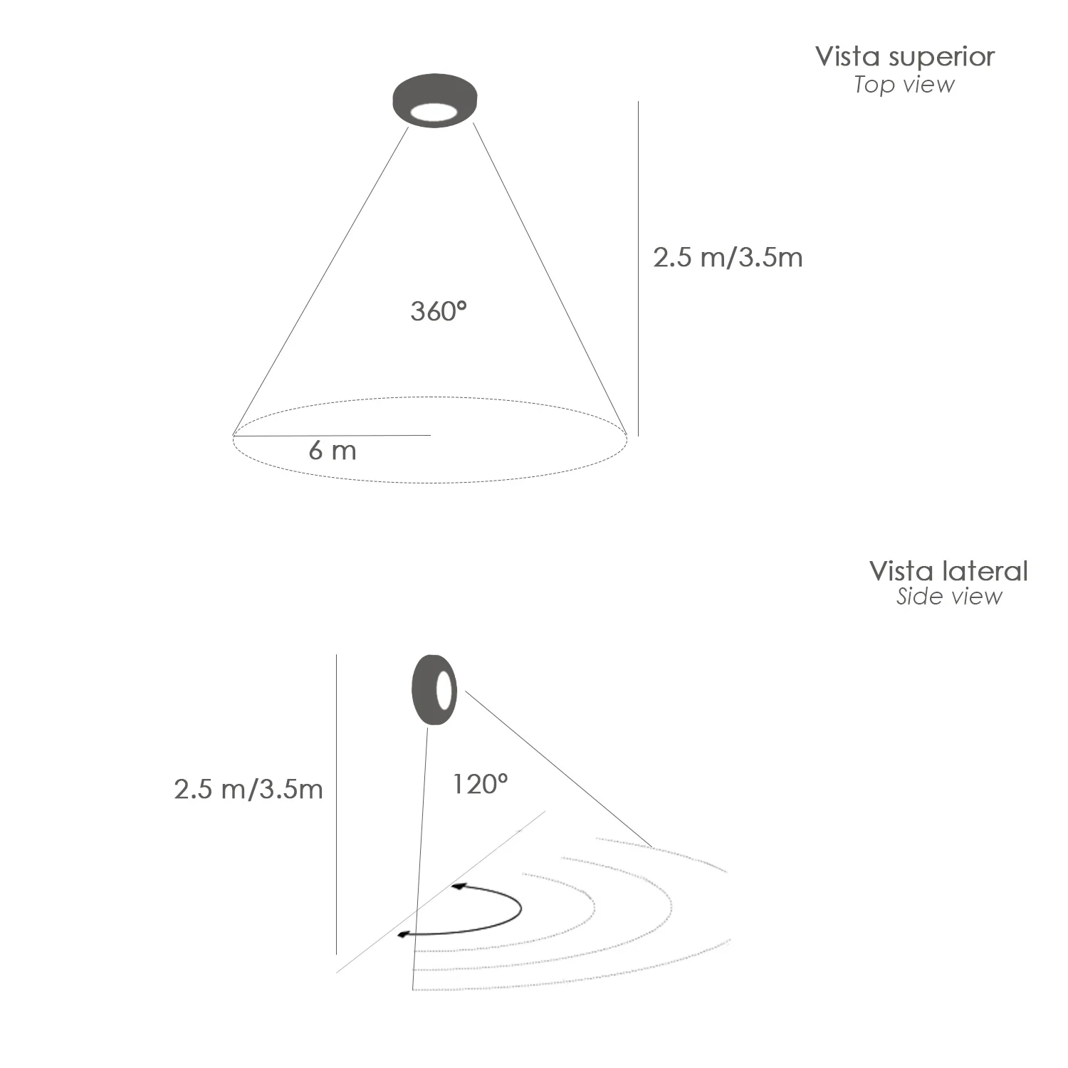 - Ángulo de detección: 360º colocado en techo, 120º colocado en pared