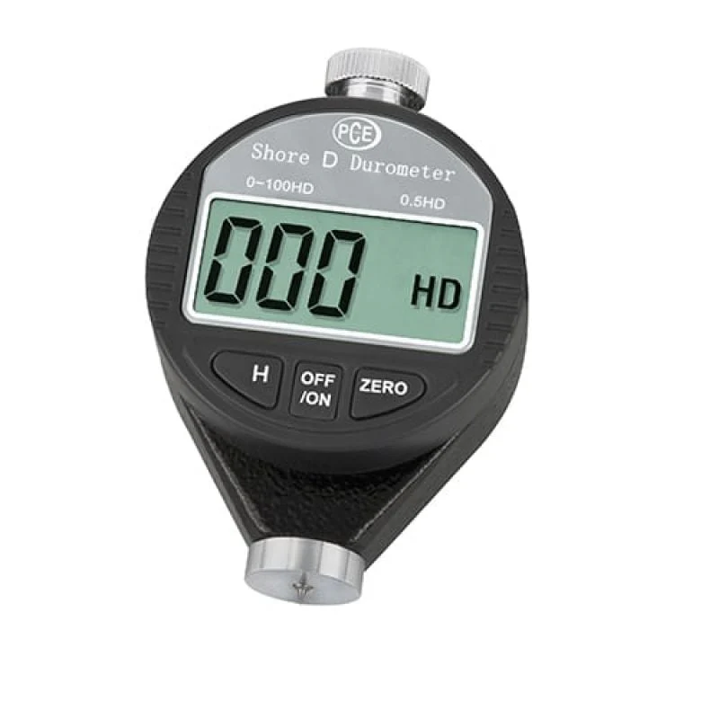 El durómetro digital es un aparato compacto para la comprobación de la dureza Shore D, que se necesita para materiales un poco más duros, como por ejemplo, goma dura y plástico térmico. Como cuerpo de penetración de durometro digital se usa un cono de 30 º y una fuerza de presión de 50 Newton. Las pruebas de medición deberían tener un espesor mínimo de 6 mm.