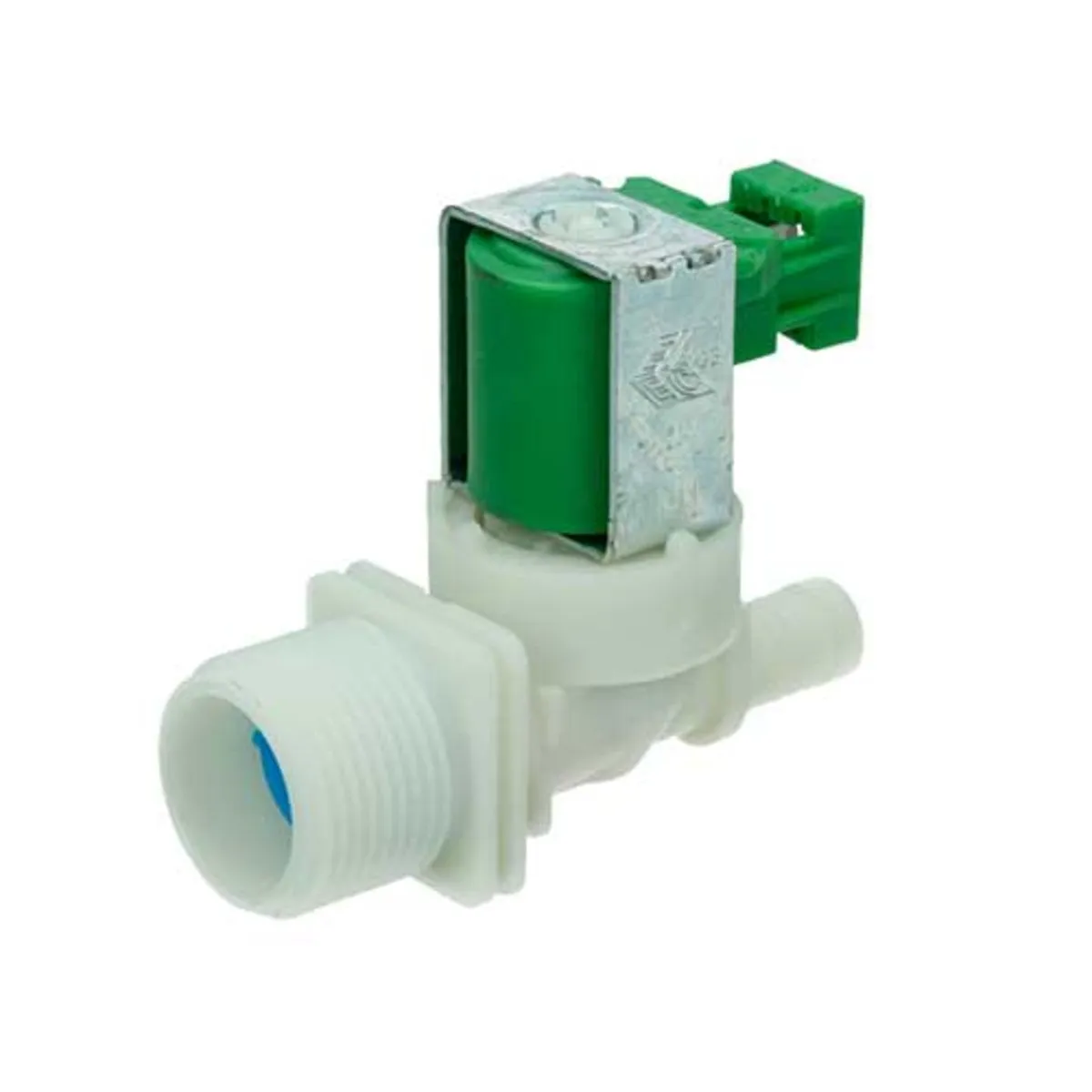 Electroválvula de una salida para lavadora y lavavajillas Zanussi, Electrolux, Corberó. Salida recta. La electroválvula es la pieza de recambio que permite la entrada de agua dentro del electrodoméstico. Una avería puede hacer que la lavadora o lavavajillas no tome agua.