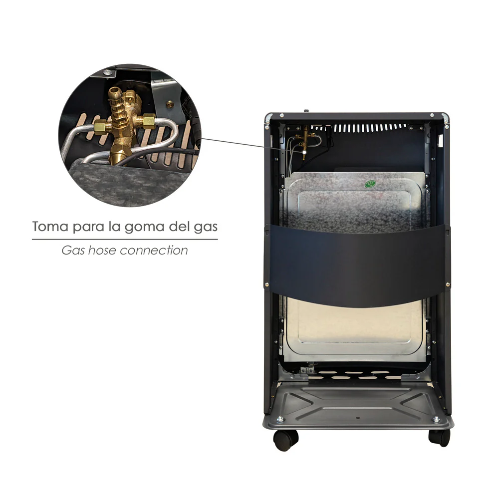 – La estufa puede ser transportada con gran facilidad gracias a sus agarres laterales y a sus 4 ruedas con giro 360º.
