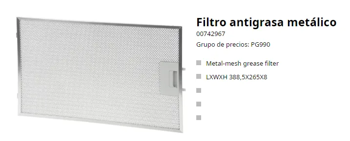 Filtro antigrasa de campana extractora Balay, Pitsos 00742967 388x265x9mm