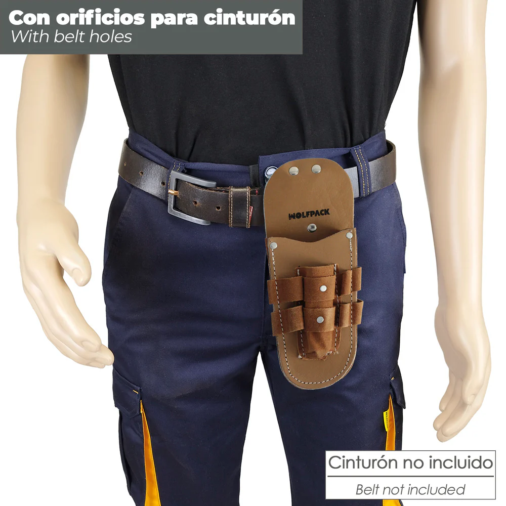 Su diseño robusto ofrece durabilidad frente al desgaste y es compatible con cinturones portaherramientas de piel o nylon, como los modelos estándar de 5 cm de ancho. Una solución eficaz para quienes buscan orden y protección en el transporte de herramientas manuales.
