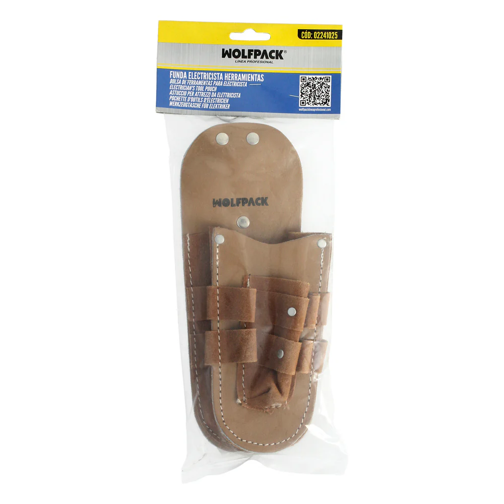 La funda de herramientas para electricista está fabricada en piel auténtica de gran resistencia, pensada para proteger y organizar destornilladores, alicates y cortacables durante el trabajo diario. Es un accesorio práctico para profesionales de la electricidad, construcción o mantenimiento que necesitan tener sus herramientas siempre accesibles y seguras.