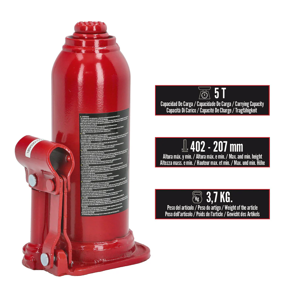Gato hidráulico tipo botella con una capacidad de carga de 5000 kg, especialmente diseñado para elevar vehículos, maquinaria o cargas pesadas de forma segura y con mínimo esfuerzo. Su sistema hidráulico con palanca permite una elevación fluida y controlada sin necesidad de aplicar fuerza excesiva.