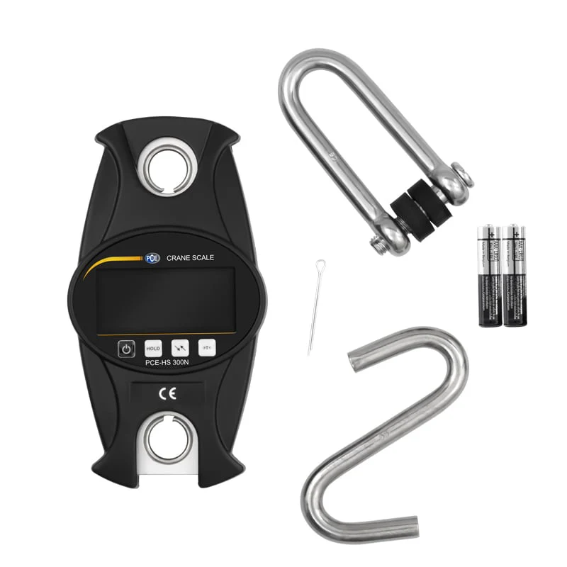 La grúa de carga se alimenta con dos pilas de 1,5 V, tipo AAA lo que permite un uso móvil. Para alargar la autonomía de las pilas la grúa de carga cuenta con la función de desconexión automática tras 15 minutos de inactividad. Opcionalmente puede solicitar a PCE Instrumentes un certificado de calibración ISO para esta grúa de carga.