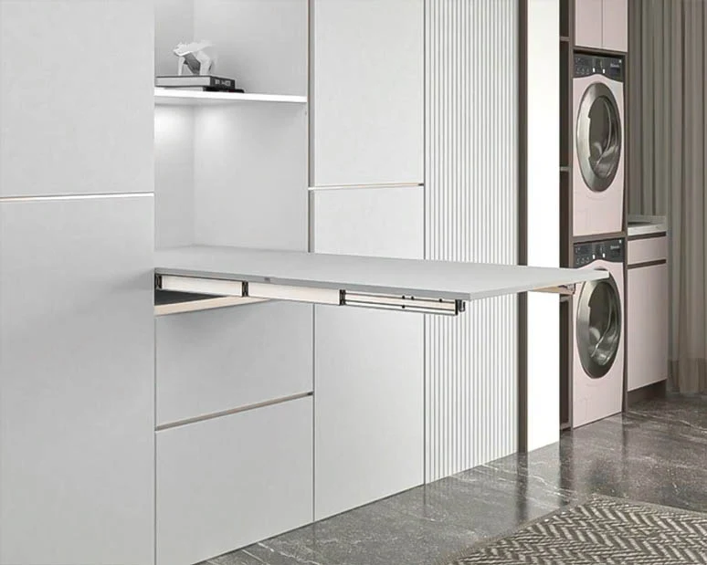 1. Hecha de aleación de aluminio con planchas de acero.2. Amplio uso: se puede utilizar en escritorios, armarios y mesasde comedor. 3. Extensión suave y silenciosa. 4. Fácil instalación. 5. Capacidad de carga: 40 K.