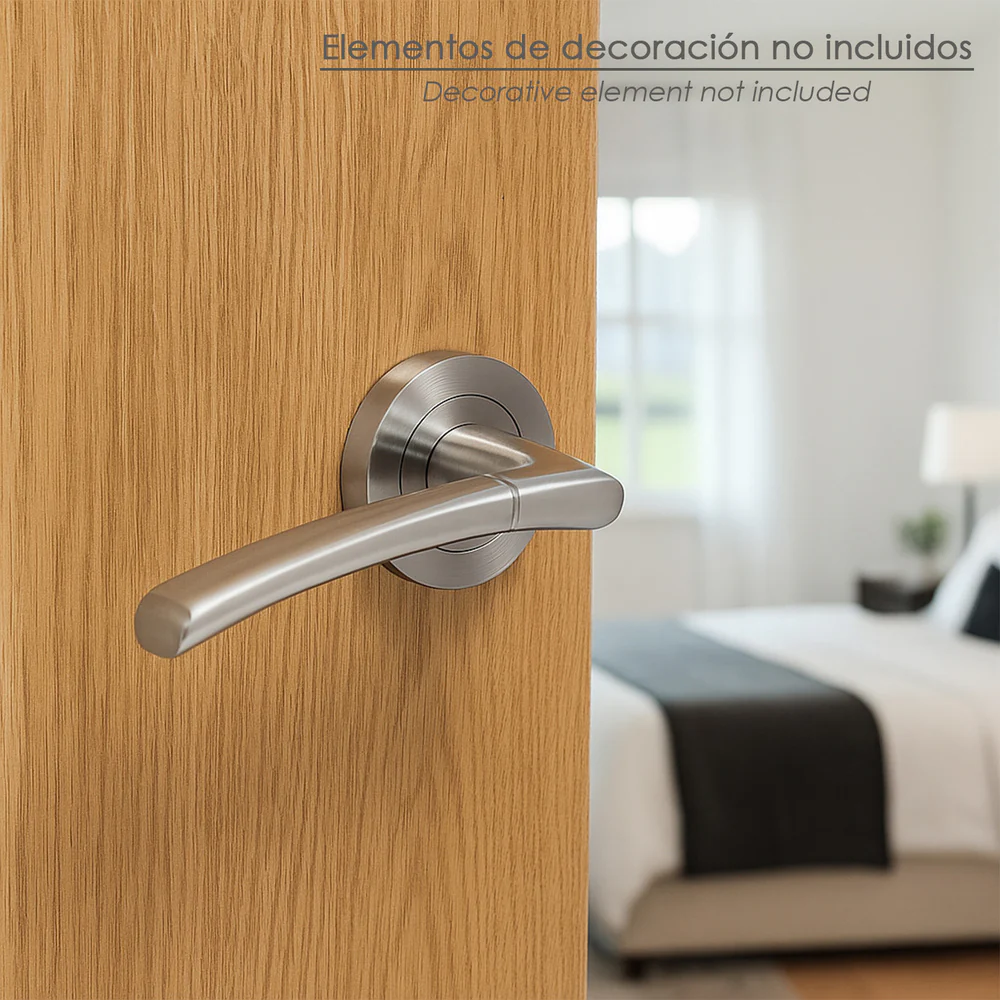 Par de manillas de diseño moderno y limpio para puertas de interior. La roseta con forma de onda y el acabado satinado aportan un toque actual y discreto, fácil de integrar en cualquier estancia.