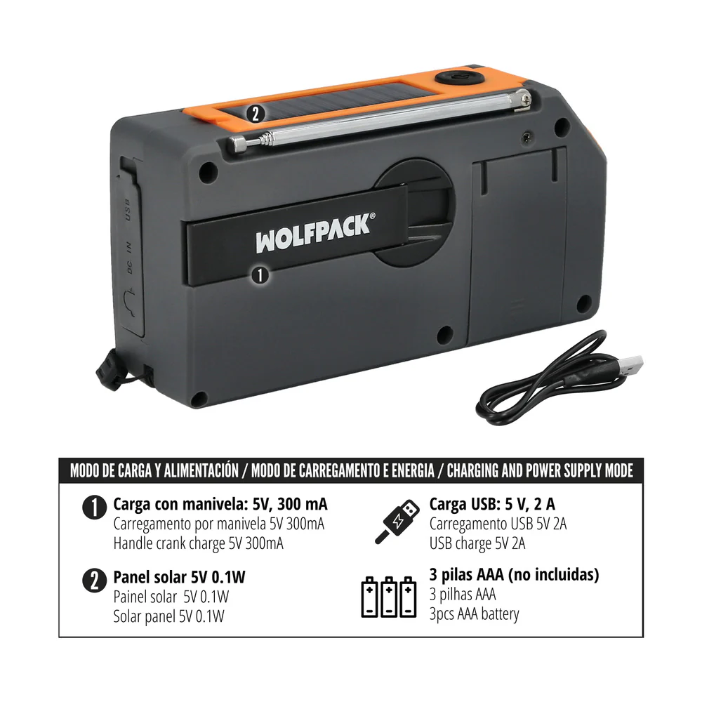 - Linterna + radio + powerbank en un solo dispositivo
