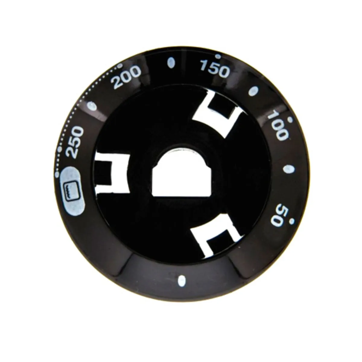Esta pieza sirve para saber la posición que se selecciona al mover el mando del aparato. Este dial sirve para elegir la temperatura del horno. Va numerada de 0 a 250 grados, que indica la temperatura a la que cortará el termostato.