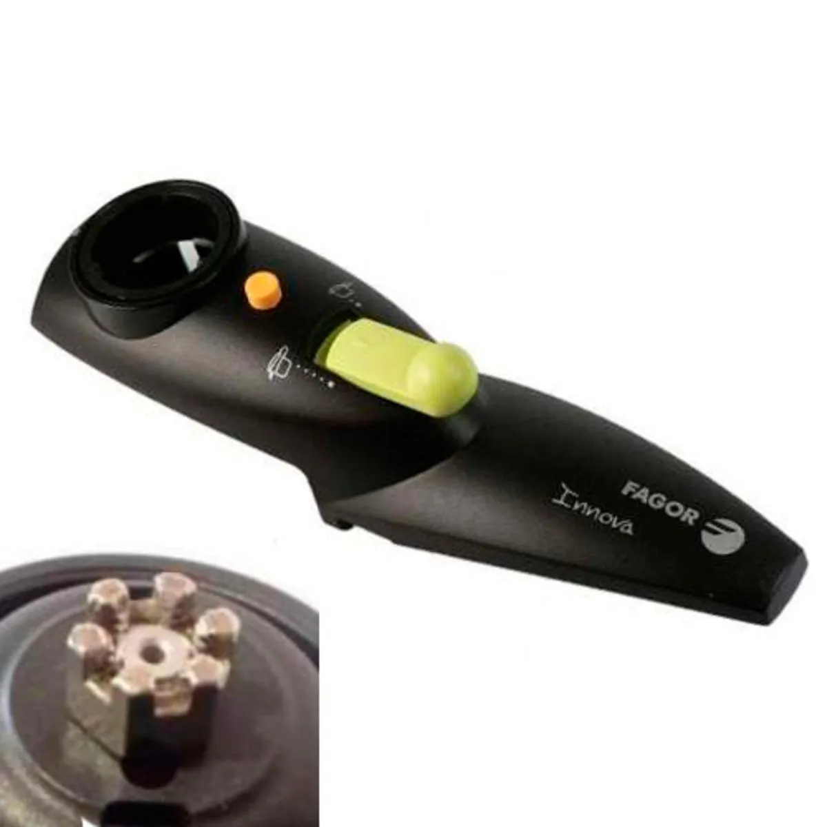Repuesto de mango superior de olla Fagor. Recambio original de olla fagor modelos gama Innova. El tornillo donde se coloca la chimenea de la válvula es de rosca gruesa. El material del que está hecho la chimenea es de aluminio.