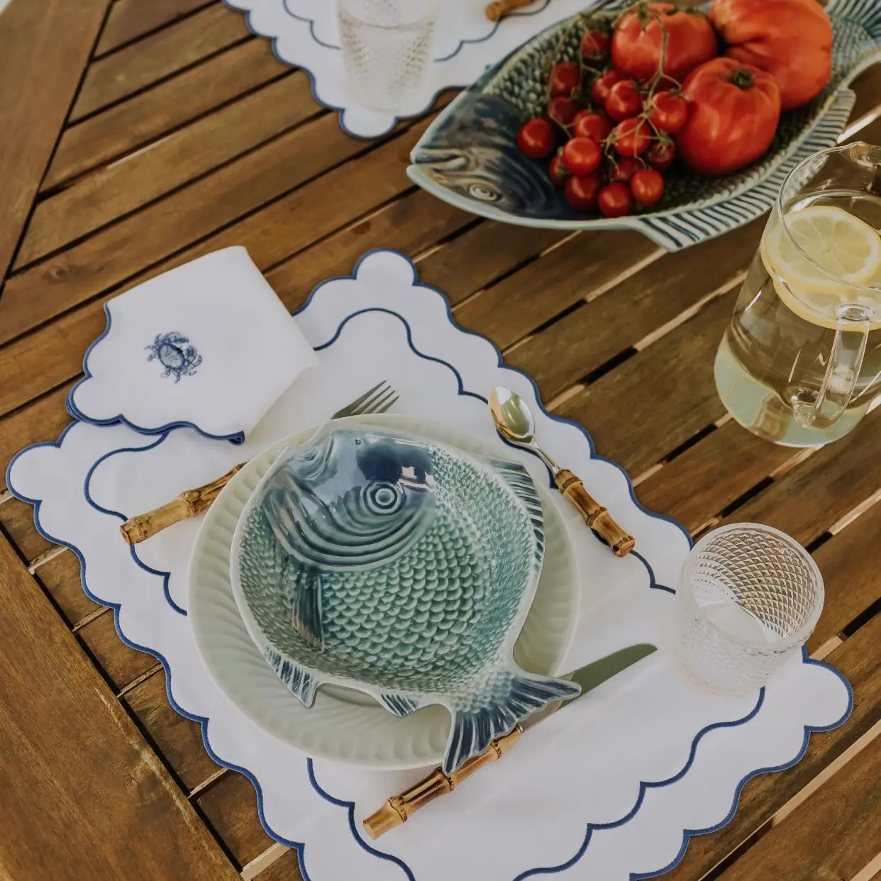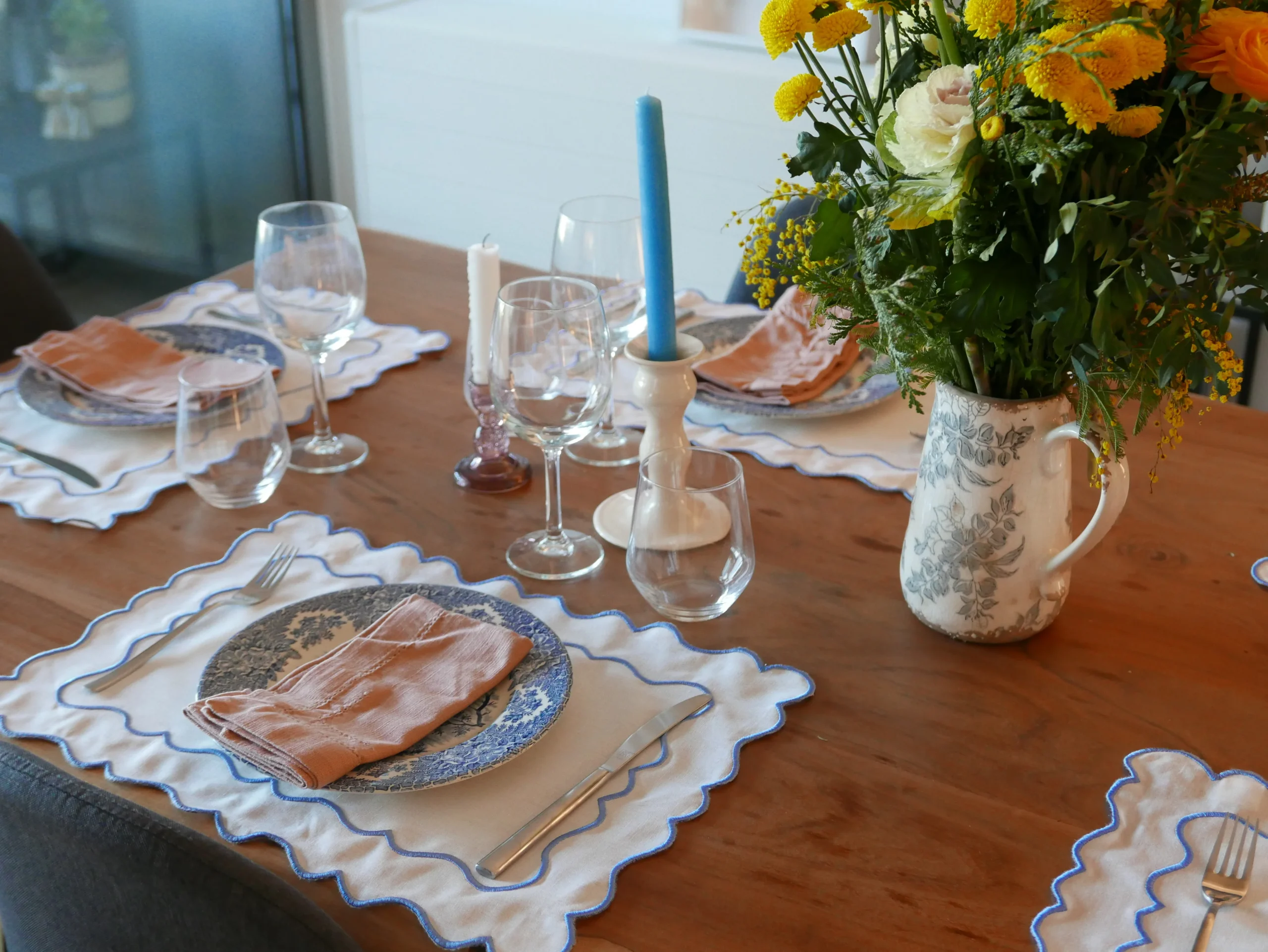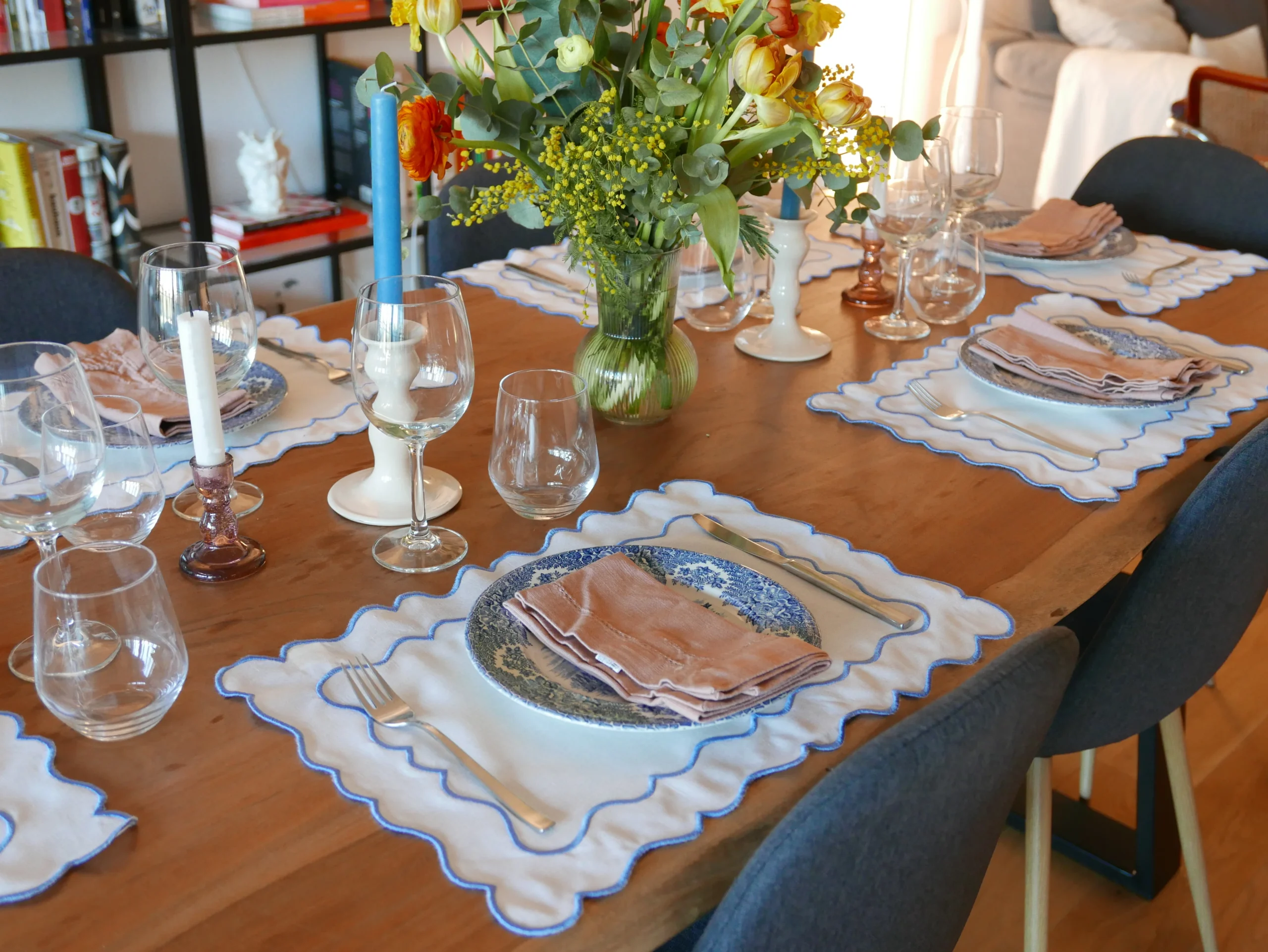Añade un toque sofisticado a tu mesa con el mantel individual ondulado en blanco y azul. Su diseño rectangular, confeccionado en una delicada mezcla de lino y algodón de alta calidad, combina elegancia y estilo, convirtiéndose en la elección perfecta para decorar tus comidas.