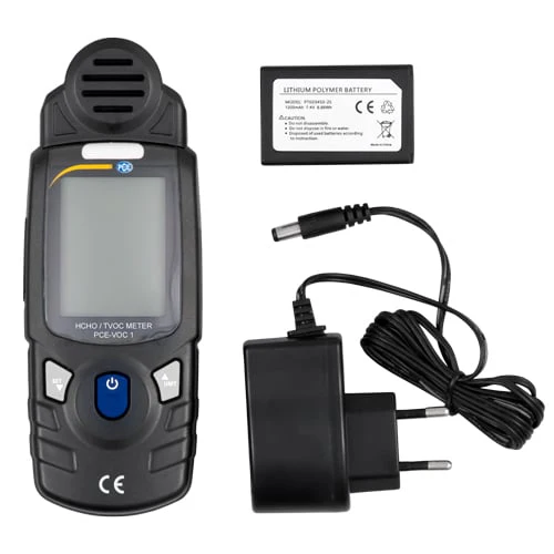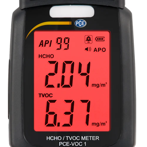 El usuario, además de ver el valor en pantalla, puede detectar una alarma de forma óptica, pues la pantalla se ilumina en rojo cuando alcanza una valor crítico COV o de HCHO. Puede visualizar la calidad del aire del medidor de formaldehído COV en mg/m³ o en ppm. El medidor de formaldehído COV modelo integra un acumulador de litio polímero que garantiza un funcionamiento de varias horas. Puede cargar el acumulador a través de la fuente de alimentación que se conecta al medidor de formaldehído COV.