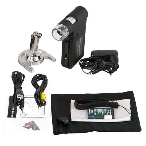 Gracias a la pantalla TFT a color de 7,62 cm y un acumulador Li-Íon, podrá trabajar con el microscopio de forma completamente móvil. Está equipado con 8 LED blancas. El microscopio alcanza 500 aumentos, lo que permite ver en imagen o video detalles muy pequeños. El microscopio incluye una cámara de 5 millones de píxeles (12 millones interpolado) que ofrece imágenes muy nítidas del objeto aumentado. La tecla zoom permite aumentar las imágenes grabadas en la pantalla a color TFT y reproducir los videos. Al igual que en una cámara digital convencional las imágenes se almacenan en la tarjeta micro SD. Tales registros los puede transferir a un PC a través de la conexión USB 2.0. La tecnología digital que usa el microscopio permite un uso universal. Es apto para la investigación, la medición precisa y la fotografía de objetos muy pequeños, sea esto en el ámbito privado, en escuelas, centros de estudio, de investigación o profesionalmente, como por ejemplo, en la comprobación de superficies. El software incluido en el envío permite almacenar imágenes y videos, archivarlos o enviarlos por email a amigos, conocidos o socios comerciales.
