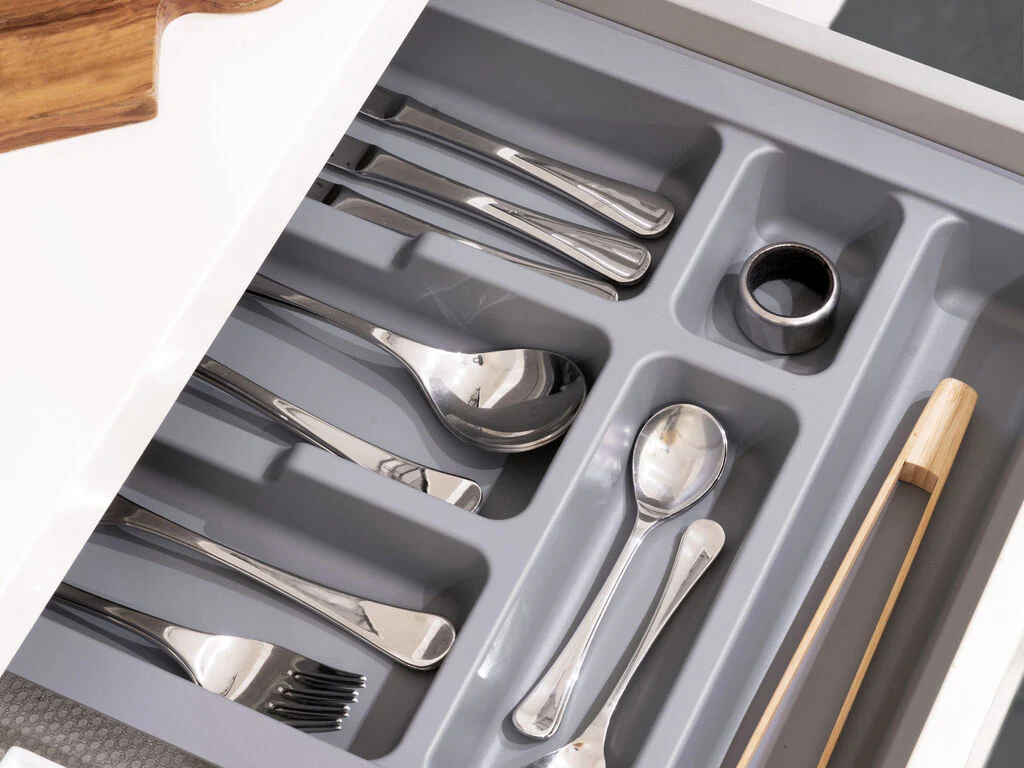 - Bandeja para cubiertos con 6 compartimentos para cuchillos, cucharas, tenedores y todo tipo de cubertería. Para almacenar y organizar los cubiertos en el cajón de la cocina.