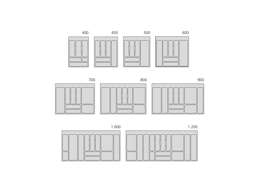 10 unidades de Cuberteros para cajones de cocina universales con un diseño recto y gran capacidad de almacenaje para cubiertos y otros utensilios de cocina aprovechando al máximo el espacio. Debido a que son recortables se pueden dimensionar para su uso con cajones montados en módulos de ancho estándar entre 400 mm y 900 mm, de profundidad entre 450 mm y 500 mm con tablero de espesores entre 16 mm y 19 mm según el modelo seleccionado.