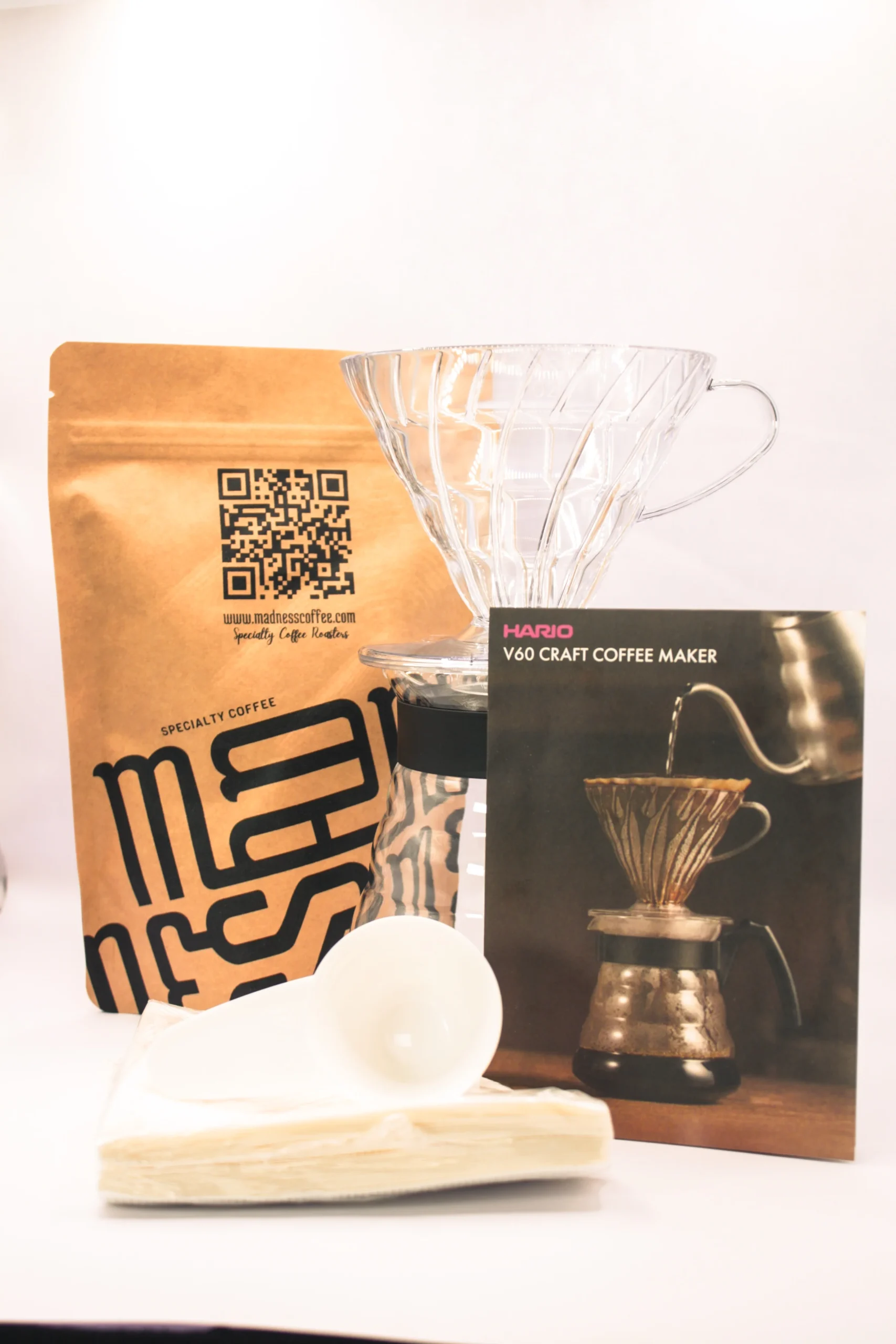 Kit V60 : jarra, método, filtros, dosificador y bolsa de café con molienda para V60