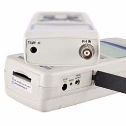 El pH-metro es un aparato de mano de fácil manejo para medir pH / mV / °C. En el pH-metro los valores de pH y la temperatura pueden ser almacenados directamente en la tarjeta SD (formato Excel) o, mediante la interfaz RS-232 puede transmitir los valores directamente al PC. Para ello ofrecemos el software y el cable de datos RS-232 como componentes opcionales. La compensación de temperatura se realiza de manera manual o automática por medio de un sensor de temperatura incluido en el envío. Todo ello proporciona una medición de pH de gran fiabilidad. El me- didor de pH tiene una calibración de tres puntos que se realiza de forma automática. Con el medidor combinado se pueden determinar el valor de pH, la temperatura o el potencial REDOX (ORP). Para este último parámetro de medición deberá solicitar un electrodo de REDOX adicional. Le recomendamos el electrodo ORP 14. El pH-metro se alimenta con baterías (el envío incluye 6 baterías de 1,5 V).