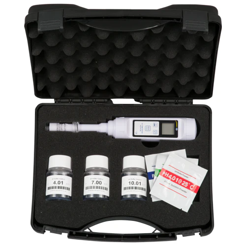 El pH-metro digital está equipado con un electrodo de membrana plano. El electrodo del pH-metro digital es alargado. Así podrá introducir el pH-metro digital en tubos de ensayos para medir el pH de medios viscosos. Esta característica permite usar pequeñas cantidades de líquido para determinar el pH. Esta característica permite al pH-metro usar pequeñas cantidades de líquido para determinar el pH. Por lo tanto, el pH-metro se puede utilizar no solo insitu sino también en el laboratorio con volúmenes muy pequeños de muestra.