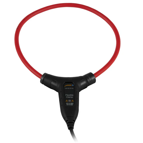La pinza amperimétrica flexible es ideal para mediciones de corrientes hasta 3000 A AC. Además de medir la corriente TRMS, también puede usar la pinza amperimetrica flexible para medir corrientes de arranque (Inrush). La medición se realiza a través de la bobina de Rogowski. Esto implica que el conducto eléctrico sobre el que se sitúa la pinza flexible induce una tensión a la pinza amperimétrica. Esta tensión es proporcional a la conducción del conducto eléctrico. Esto permite medir con pinza amperimetrica flexible corrientes muy altas con poco peligro. Adicionalmente a la medición de corriente, la pinza amperimétrica mide frecuencias en un rango de 50 a 400 Hz.