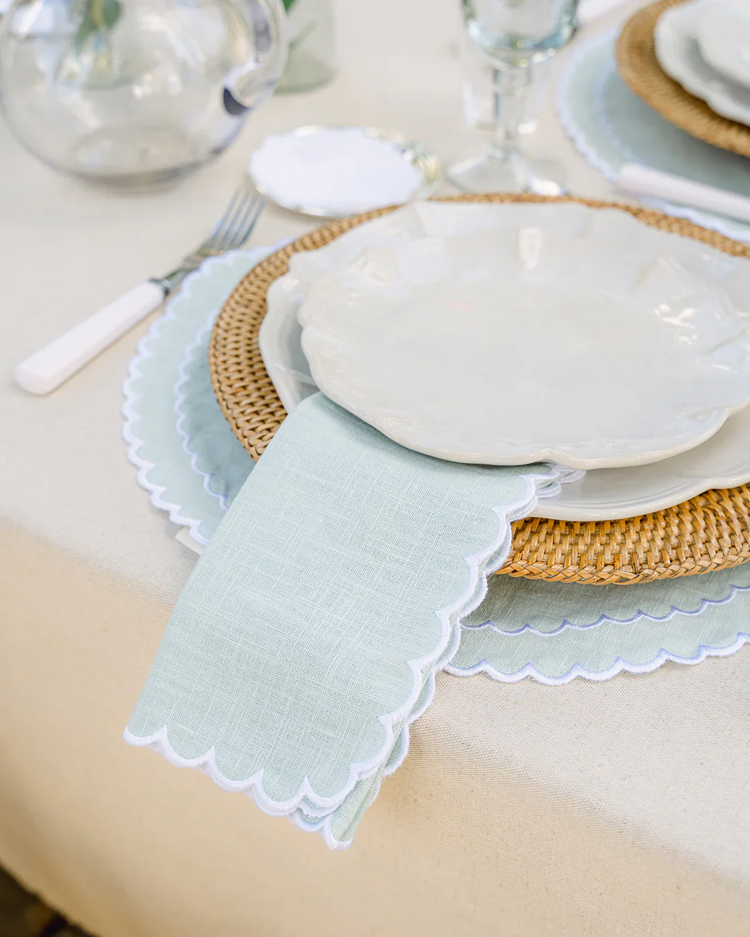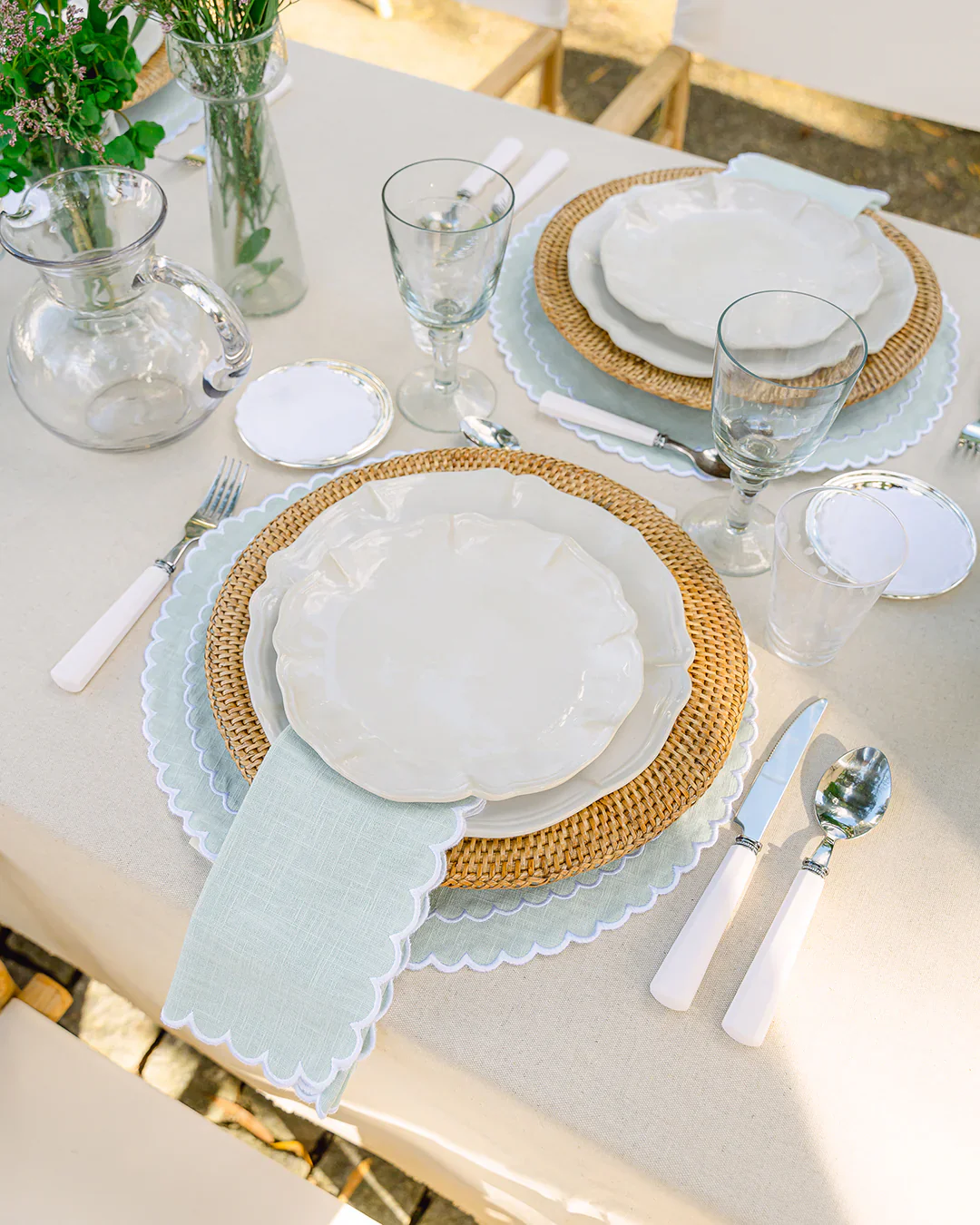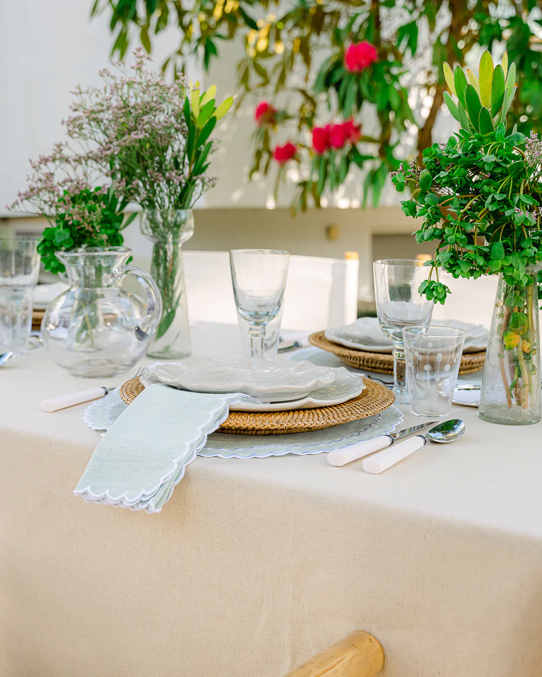 El diseño de la servilleta Filipa se distingue por su sencillez y armonía, siendo perfecta para crear un ambiente luminoso y relajante en tu comedor. El contraste entre el verde agua y el blanco no solo resalta, sino que también evoca serenidad, lo que la convierte en una excelente elección para cenas formales o reuniones informales con amigos y familia.