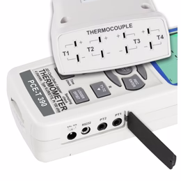 El termómetro de contacto digital es un termometro con cuatro canales de entrada alimentado por baterías con memoria interna a través de una tarjeta SD (1 a 16 GB) para sondas tipo K / J / T / E / R / S y dos canales para sensores de temperatura Pt100. Los valores registrados en el termometro se guardan en la tarjeta de memoria en formato xls, por lo que no necesita ningún software adicional para su valoración. El termometro tiene un software y que no está incluido en el envío del termómetro, por lo que hace posible registrar a través del puerto RS-232, los valores en tiempo real en su PC. El termometro de contacto PCE-T 390 lo puede usar como aparato de mano para mediciones in situ, y también para mediciones continuas y vigilancia gracias a su memoria. El termómetro de varios canales lo puede usar prácticamente de forma ilimitada en el mantenimiento, la conservación, el diagnóstico de máquinas y el control de calidad. A la hora de registrar datos en el termometro puede seleccionar libremente la cuota de medición. También puede usar este termometro de contacto para la medición en tiempo real y como registrador de datos. Puede conectar al termómetro cualquier sonda de temperatura del tipo K / J / T / E / R / S y Pt100. Por favor, tenga en cuenta que nosotros proporcionamos sólo sondas tipo K y Pt100 para este termómetro. También se puede seleccionar el intervalo de grabación en el termómetro de contacto digital durante la grabación de dichos datos. En la pantalla del termometro de contacto digital podrá ver simultáneamente las temperaturas de los cuatro canales (siempre que se encuentren conectados los sensores correspondientes).