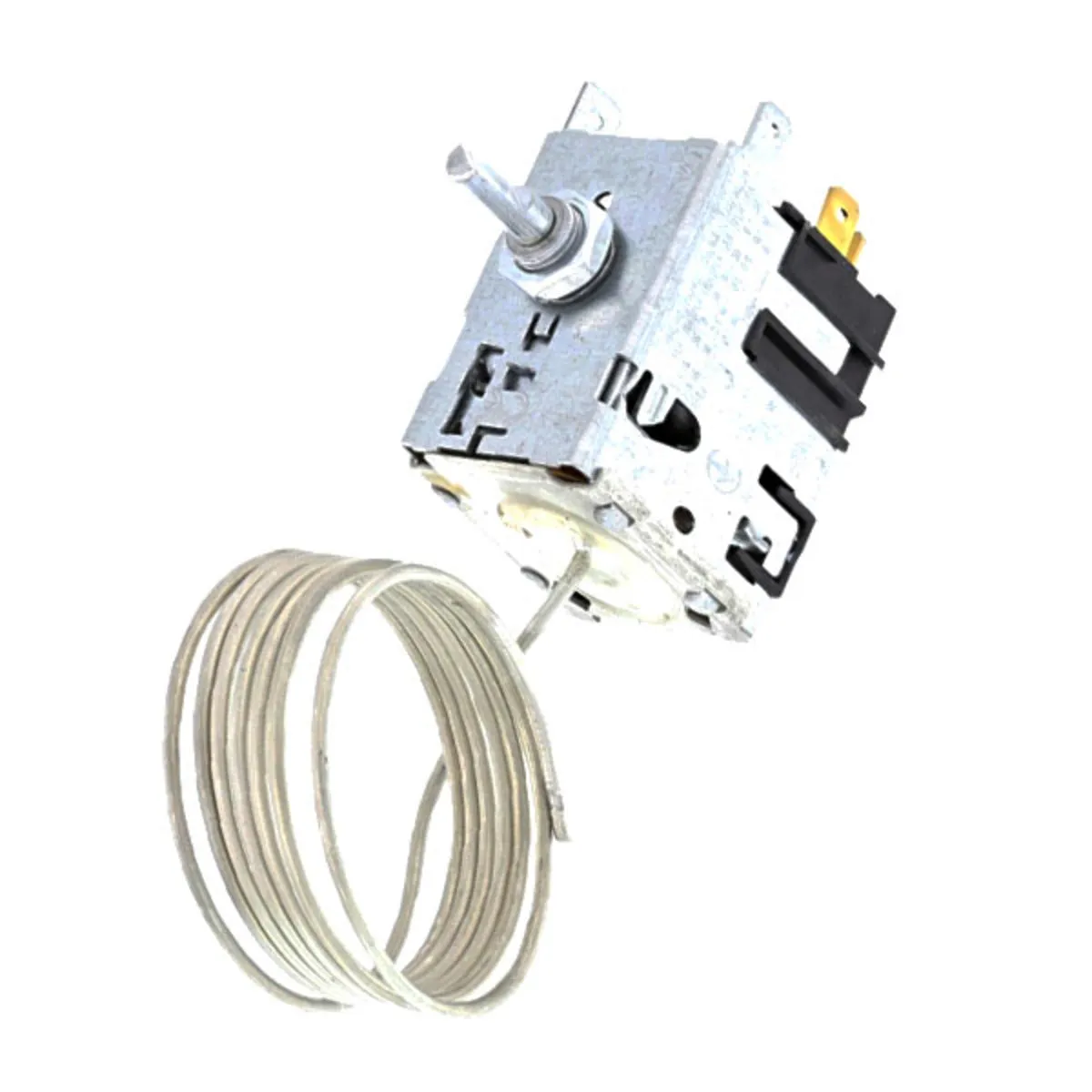 Pieza de recambio para reparación de congelador de arcón. El termostato detecta la temperatura del interior del electrodoméstico y hace que el motor se ponga en marcha cuando sea necesario.